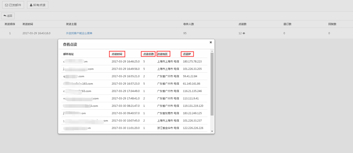 能够清楚追踪到邮件的点击次数、退订数、以及回复数等,这个就是作为持续营销的依据,也能很好的抓住有点读的客户进行重点跟进。