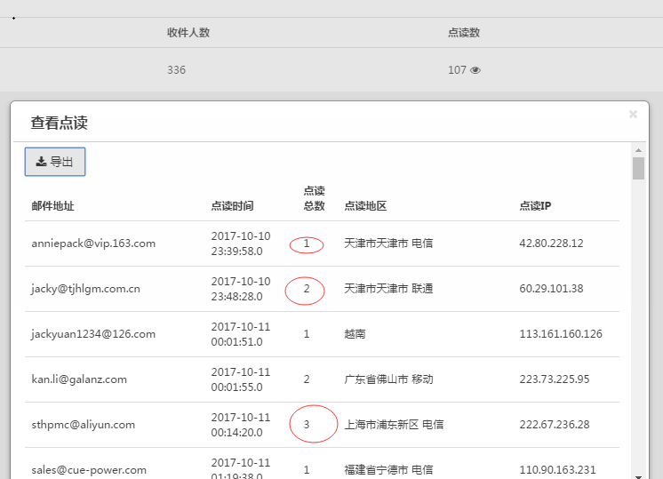 点读地址;时速外贸营销邮客户Janis,一直有邮件联系美国的一个客户,虽然客户没有回复,但是追踪到有点读并且都是美国地址。有一天忽然发现一封邮件的点读地址从美国变成了中国东莞,这个时候时候Janis知道客户来中国了,马上一封邮件写给客户,约其来工厂见面,不久之后就与客户确定合作了。